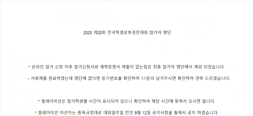 제20회 전국학생로봇경진대회 최종 참가자 명단 작성자 대회사무국 작성일 2025.09.05 15:14 댓글 0 조회수 1241 . [이 게시물은 대회사무국님에 의해 2025-09-05 15:33:12 [백업] 공지사항에서 이동 됨]